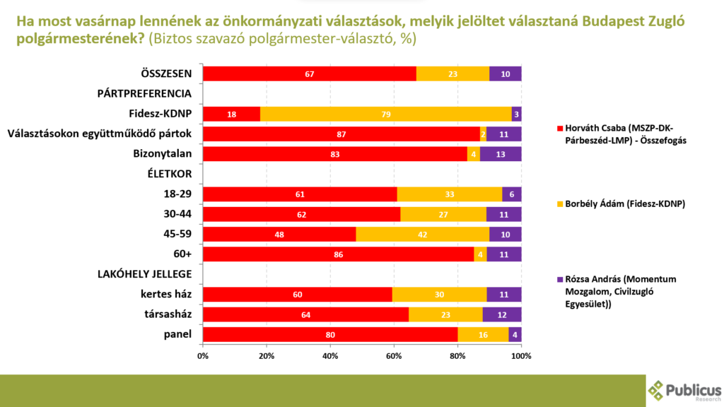 Ha most vasárnap lennének önkormányzati választások, a válaszadók kétharmada (67 százalék) Horváth Csabára szavazna. Így nyilatkozott a választásokon együttműködő ellenzéki pártok szavazói közül tízből kilenc (87 százalék), tízből nyolc (83 százalék) bizonytalan szavazó, illetve közel minden ötödik (18 százalék) Fidesz szavazó. Leginkább a 60 évnél idősebbek (86 százalék), és a panelházban lakók (80 százalék) nyilatkoztak így.