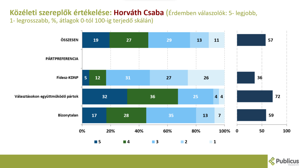 Horváth Csaba népszerűsége (85 százalékos ismertség mellett) a választásokon együttműködő ellenzéki pártok szavazóinál átlagosan 72 százalékpont, a bizonytalan szavazóknál 59 százalékpont, a Fidesz szavazóknál pedig 36 százalékpont.