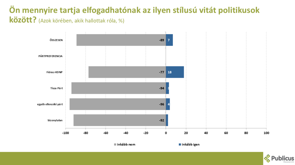 A Tisza párt elnöke és a Fidesz kommunikációs igazgatója között lezajlott heves szóváltás tízből kilenc válaszadó szerint politikusok között nem elfogadható stílusban zajlott. A kialakult hangnemért a relatív többség Menczer Tamást tartotta felelősnek, és az egyértelmű többség a két politikus közül inkább Magyar Péter viselkedését gondolta elfogadhatóbbnak.