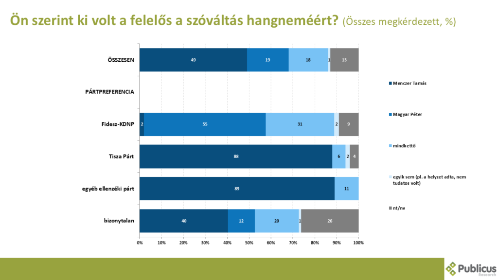 A kialakult hangnemért a relatív többség (49%) Menczer Tamást tartotta felelősnek, azonban az emberek véleményét nagyban befolyásolták a politikai nézeteik. Amíg a Fidesz szavazóinak mindössze 2 százaléka tartotta felelősnek a Fidesz kommunikációs igazgatóját, a Tisza Párt és egyéb ellenzéki pártok szavazói közül tízből kilencen (88% és 89%), a bizonytalanok közül pedig tízből négyen (40%) gondolták ezt így. Nem meglepő módon a Fidesz szavazók relatív többsége (55%) Magyar Pétert nevezte meg felelőséként, ebben azonban csak a bizonytan szavazók tizede (12%) értett velük egyet. A válaszadók 18 százaléka szerint a kialakult hangnemért mindkét politikust felelősség terheli – érdekes módon a kormánypárt szavazóinak harmada (31%) így vélekedett, a bizonytalanok 20 százalékával, az egyéb ellenzéki pártok 11 százalékával, és a Tisza Párti szavazók 6 százalékával egyetemben.