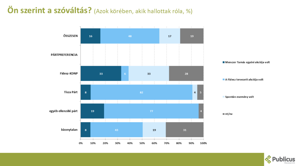 A megkérdezettek relatív többsége (48%) szerint a szóváltás a Fidesz tervezett akciója volt. A Tisza Párt szavazói közül tízből nyolcan (82%) gondolták ezt így, öt százalékponttal magasabb arányban, minta a többi ellenzéki pártok szavazói (77%). A bizonytalan szavazók relatív többsége (44%) is így nyilatkozott, azonban a kormánypárt szavazói közül csupán 6 százalék vélt ilyen szándékosságot az esemény mögött. Jóval kevesebben cserébe inkább úgy gondolták, hogy a szóváltás Menczer Tamás egyéni akciója (16%), vagy spontán esemény volt (17%).