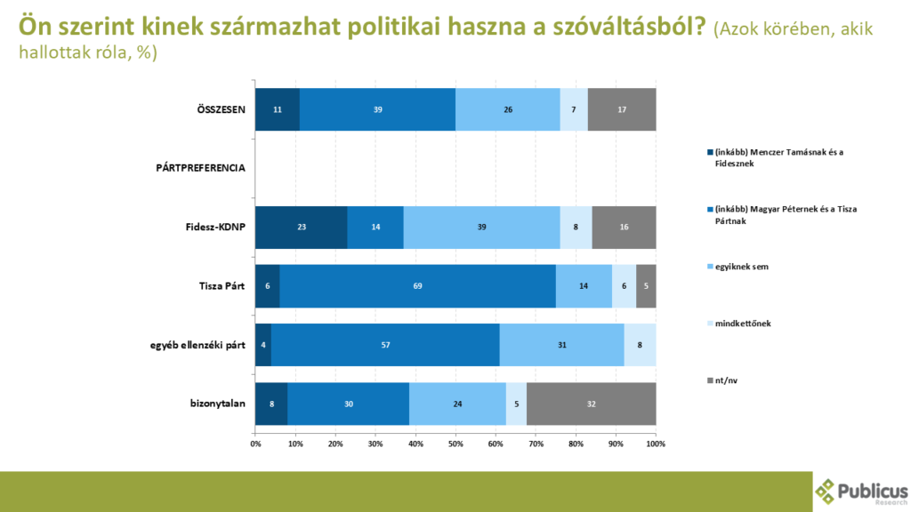 A válaszadók legnagyobb része (39%) szerint politikai haszna inkább Magyar Péternek és a Tisza Pártnak származhat a lezajlott jelenetből. A Tisza Párt szavazóinak 69 százaléka, a többi ellenzéki párt szavazóinak 57 százaléka, és a bizonytalanok 30 százaléka így nyilatkozott, a kormánypárti szavazók 14 százalékával egyetemben. Jóval kevesebben (11%) gondolták úgy, hogy a szóváltás inkább Menczer Tamásnak és a Fidesznek válik majd az előnyére. A Fidesz szavazók között is mindössze minden negyedik (23%) nyilatkozott így, a bizonytalanok 8 százaléka, a Tisza Párti szavazók 6 százaléka, és az egyéb ellenzéki pártok szavazóinak 4 százalékával együtt. Minden negyedik válaszadó (26%) szerint azonban az eseményből egyik oldal sem hajt majd hasznot.