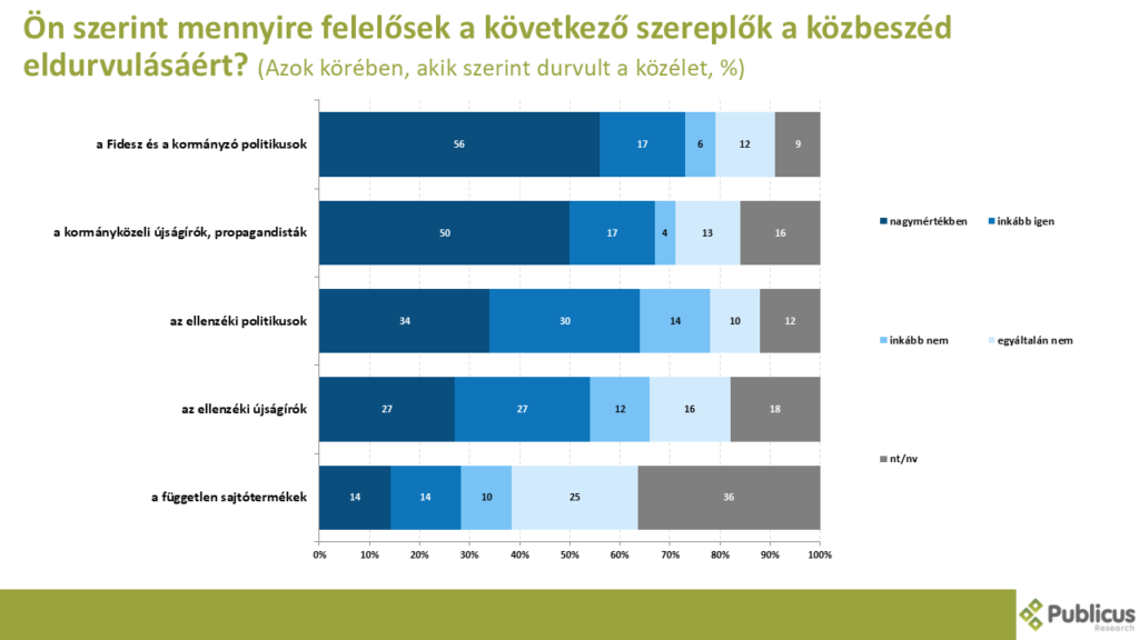 Pártállástól majdnem függetlenül, tízből nyolc (81%) válaszadó szerint az utóbbi időben eldurvult a közbeszéd. Legnagyobb arányban a korábbi ellenzéki pártok szavazói (93%) nyilatkoztak így, de a különbség nem sok mind a Tisza Párt (85%), mind a Fidesz (82%) támogatóihoz, mind bizonytalan (77%) szavazókhoz mérve.