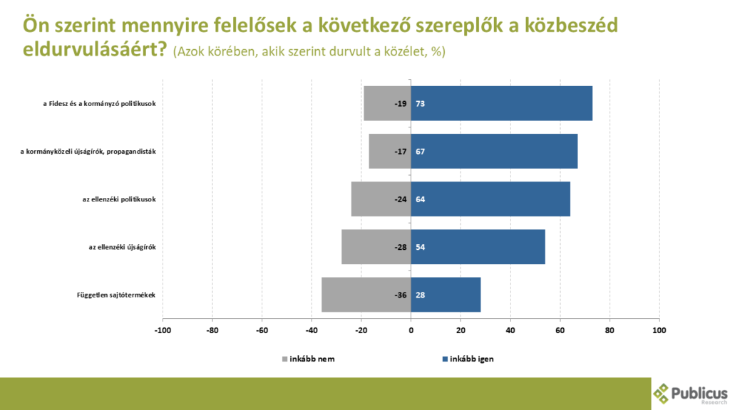 A jelenség hátterében a válaszadók legnagyobb aránya a Fideszt és a kormányzó politikusokat nevezte meg felelőséként (73%). Nem meglepő módon a Tisza Párt és egyéb ellenzéki pártok szavazói vélekedtek így leginkább (96 és 89 százalék), azonban nemcsak, hogy a pártnélküli válaszadók 79 százaléka is így nyilatkozott, de még a Fidesz támogatóinak szűk harmada (30%) is a kormánypárti politikusokat nevezte meg felelősként. A válaszadók kisebb aránya szintén felelősként nevezte meg a kormányközeli újságírókat, illetve propagandistákat (67%), és az ellenzéki politikusokat is (64%).