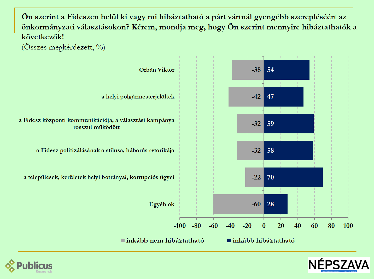 Tízből hét (70 százalék) megkérdezett szerint a települések, kerületek helyi botrányai, korrupciós ügyei inkább tehetnek a Fidesz vártnál gyengébb eredményeiért. Tízből hat (59 százalék) válaszadó szerint a Fidesz központi kommunikációja, a választási kampánya működött rosszul, továbbá minden második megkérdezett (54 százalék) szerint Orbán Viktor személye tehet a Fidesz vártnál gyengébb szerepléséért. Még a kormánypárti szavazók 28 százaléka szerint is a miniszterelnök felelős a rosszabb eredményekért.
