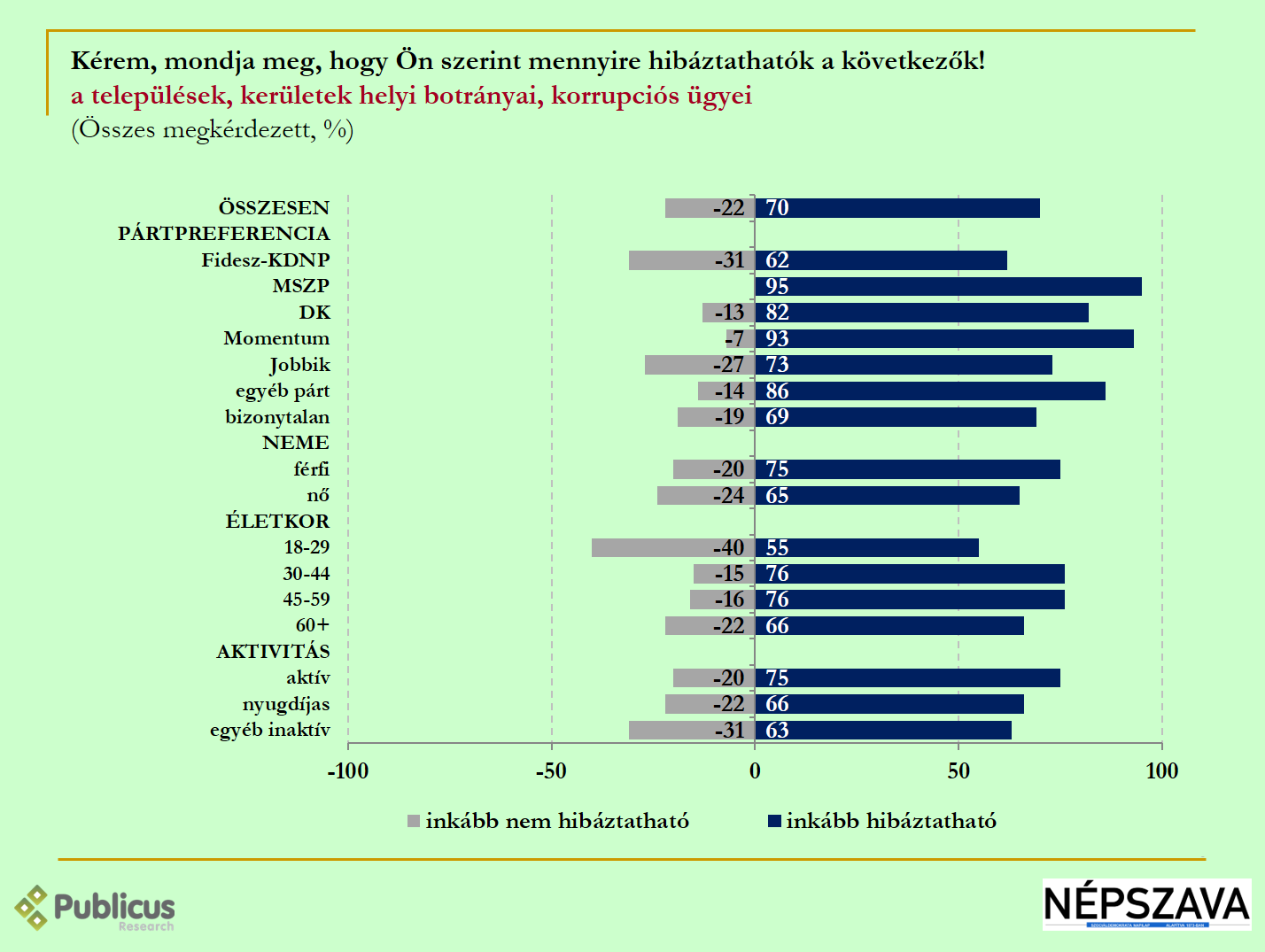 Tízből hat (62 százalék) Fidesz szavazó szerint a települések, kerületek helyi botrányai, korrupciós ügyei inkább hibáztathatók az önkormányzati választás eredményeiért. Az ellenzéki szavazók közül a legnagyobb arányban az MSZP és a Momentum (95 és 93 százalék) szavazói látták ugyanígy. Tízből négy (40 százalék) fiatal (18-29) válaszadó, illetve tízből három (31 százalék) Fidesz szavazó szerint azonban a helyi problémás ügyek inkább nem hibáztathatók a kormánypárt vártnál gyengébb szerepléséért.