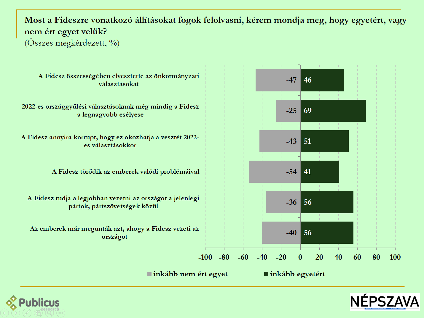 Tízből közel hat (56 százalék) megkérdezett szerint a Fidesz tudja a legjobban vezetni az országot a jelenlegi pártok, pártszövetségek közül, azonban ugyanilyen arányban (56 százalék) mondták azt is, hogy az emberek megunták már azt, ahogy a Fidesz vezeti az országot, továbbá minden második válaszadó (51 százalék) szerint a kormánypárt annyira korrupt, hogy ez okozhatja majd a vesztét a 2022-es választásokkor.