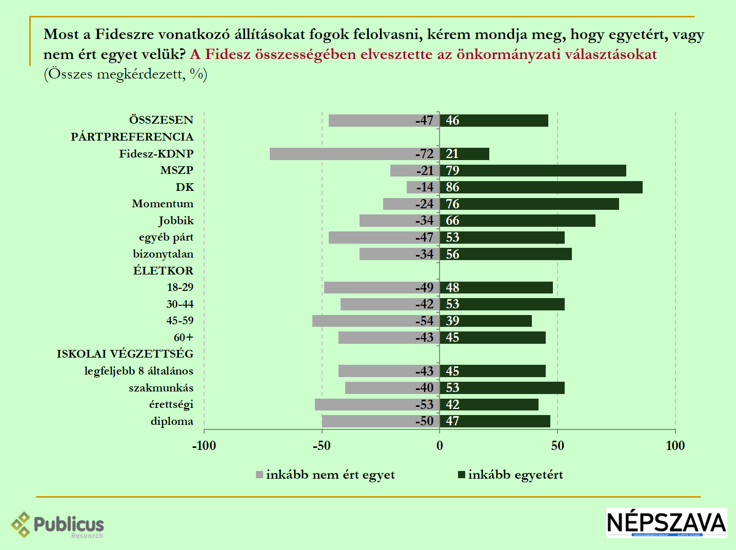 A megkérdezettek közel fele-fele értett egyet, (46 százalék) illetve nem értett egyet (47 százalék) azzal az állítással, hogy a Fidesz összességében elvesztette az önkormányzati választást. A kormánypárti szavazók többsége nem, az ellenzékiek többsége viszont egyetértett az állítással.