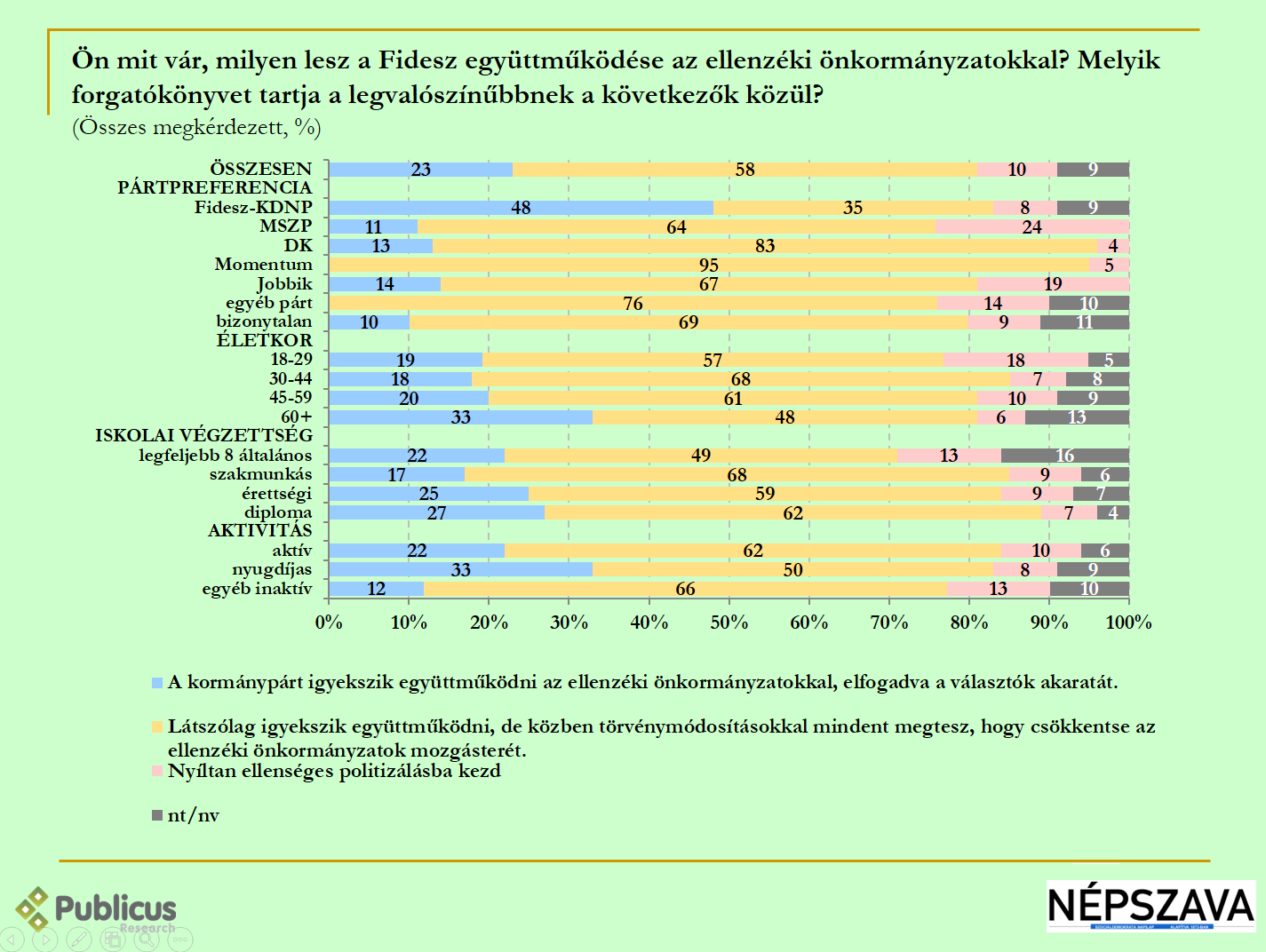 Minden ötödik megkérdezett (23 százalék) azzal az állítással értett egyet, hogy a kormánypárt igyekszik együttműködni az ellenzéki önkormányzatokkal, elfogadva a választók akaratát. Tízből hat (58 százalék) válaszadó szerint a kormány csak látszólg igyekszik együttműködni, de közben mindent megtesz, hogy csökkentse az ellenzéki önkormányzatok mozgásterét, illetve minden tizedik (10 százalék) megkérdezett szerint a Fidesz nyíltan ellenséges politikába fog kezdeni.
