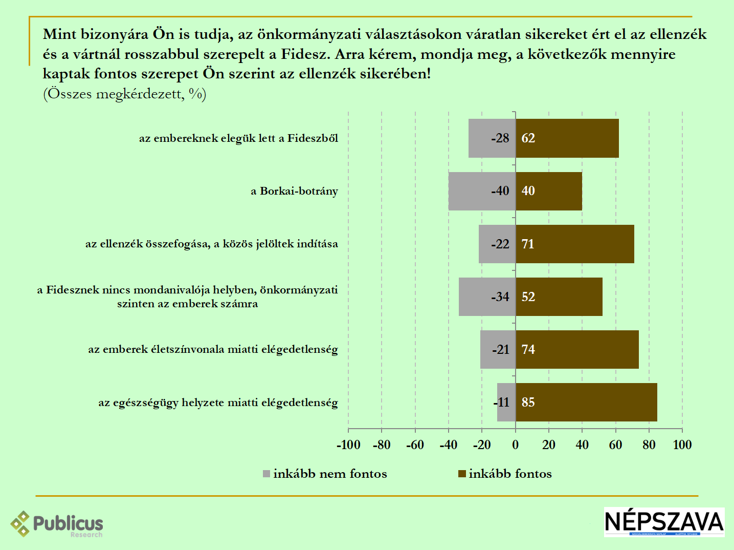 Tízből majd’ kilenc (85 százalék) megkérdezett szerint az egészségügy helyzete miatti elégedetlenség vezetett ahhoz, hogy a vártnál rosszabbul szerepelt a Fidesz az önkormányzati választáson. Ezen kívül a válaszadók háromnegyede (74 százalék) szerint az emberek életszínvonala miatti elégedetlenség, illetve 71 százaléka szerint az ellenzéki összefogás, a közös jelöltek indítása játszott inkább fontos szerepet az ellenzék sikerében. Csak tízből négy (40 százalék) megkérdezett mondta azt, hogy a Borkai-botrány játszott inkább fontos szerepet abban, hogy a vártnál rosszabbul szerepelt a Fidesz, illetve a vártnál jobban az ellenzék.