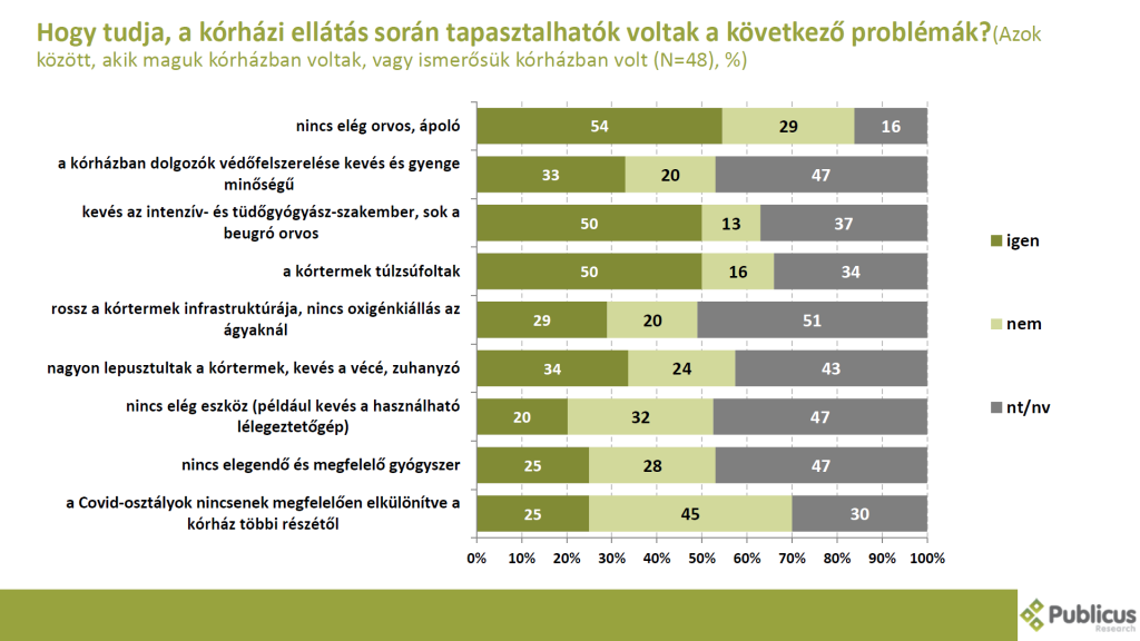 Azok közül, akik vagy maguk voltak kórházban, vagy valamelyik ismerősük, minden második megkérdezett azt mondta, hogy nincs elég orvos, ápoló (54 százalék), kevés az intenzív- és tüdőgyógyász-szakember, sok a beugró orvos (50 százalék), illetve hogy a kórtermek túlzsúfoltak voltak. (50 százalék)
