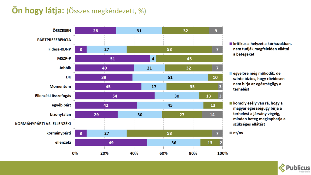 Tízből hat (58 százalék) Fidesz szavazó szerint a magyar egészségügy bírni fogja a terhelést, és minden beteg meg fogja kapni a megfelelő ellátást. Az ellenzéki szavazók sokkal rosszabbnak látják a helyzetet: minden második (49 százalék) ellenzéki szavazó szerint kritikus a helyzet a kórházakba, nem tudják megfelelően ellátni a betegeket, továbbá a szintén e tábor harmada szerint az egészségügy egyelőre még működik, de szinte biztos, hogy rövidesen nem bírja tovább a terhelést.