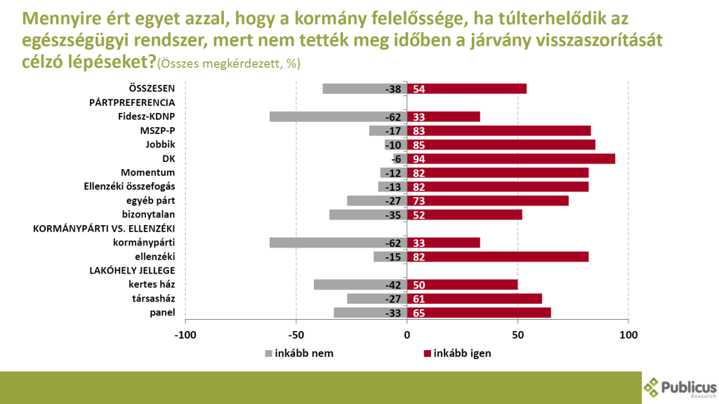 A megkérdezettek többsége (54 százalék) szerint a kormány felelőssége, ha túlterhelődik az egészségügyi rendszer, mert nem tették meg időben a járvány visszaszorítását célzó lépéseket. Így gondolja tízből nyolc (82 százalék) ellenzéki, illetve tízből három (33 százalék) Fidesz szavazó is.