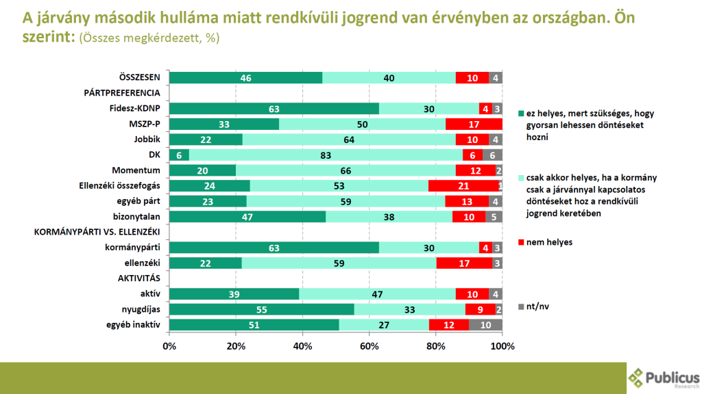 Tízből hat (63 százalék) Fidesz szavazó szerint helyes, hogy rendkívüli jogrend van az országban, mert szükséges, hogy gyorsan lehessen döntéseket hozni, tízből három (30 százalék) kormánypárti szavazó szerint pedig csak akkor helyes a rendkívüli jogrend fenntartása csak akkor helyes, ha a kormány csak a járvánnyal kapcsolatos döntéseket hoz a rendkívüli jogrend keretében.