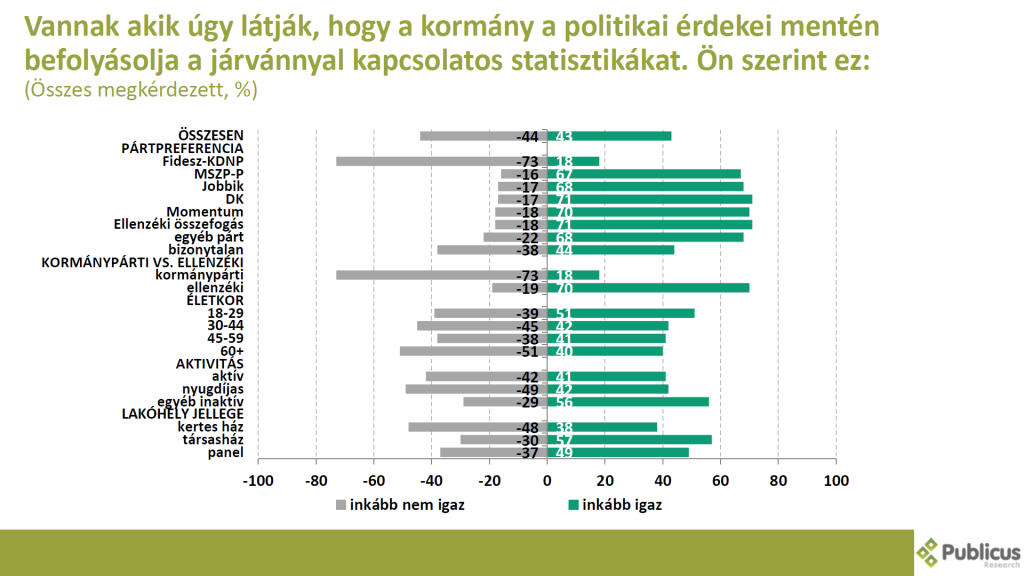 Tízből négy válaszadó szerint (43 százalék) inkább igaz az, hogy a kormány a politikai érdekei mentén befolyásolja a járvánnyal kapcsolatos statisztikákat. Tízből hét (70 százalék) ellenzéki szavazó így látja, továbbá a Fidesz szavazóknál is tízből kettő (18 százalék).