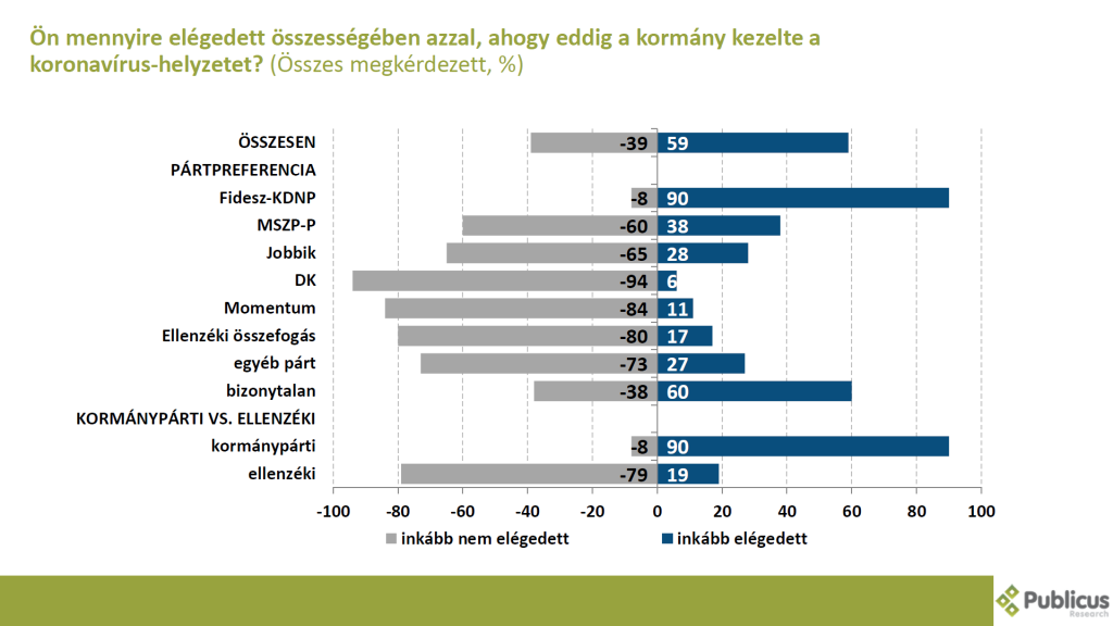 Tízből hat (59 százalék) megkérdezett inkább elégedett összeségében azzal, ahogy eddig a kormány kezelte a koronavírus-helyzetet. Tízből kilenc (90 százalék) Fidesz szavazó elégedett a kormány teljesítményével. Ezzel szemben tízből nyolc ellenzéki szavazó (79 százalék) inkább nem elégedett azzal, hogy a kormány milyen lépések tett a koronavírus-válság során.