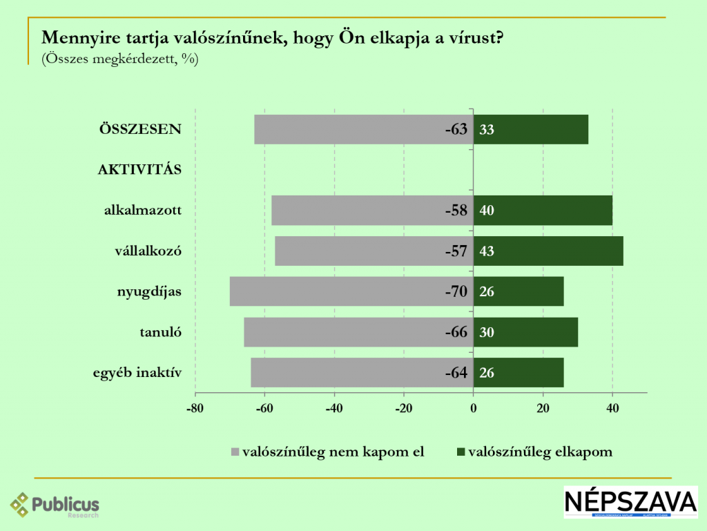 Leginkább a vállalkozók és az alkalmazottak (43, illetve 40 százalék) gondolják úgy, hogy elkapják a koronavírust, legkevésbé pedig a nyugdíjasok (26 százalék).
