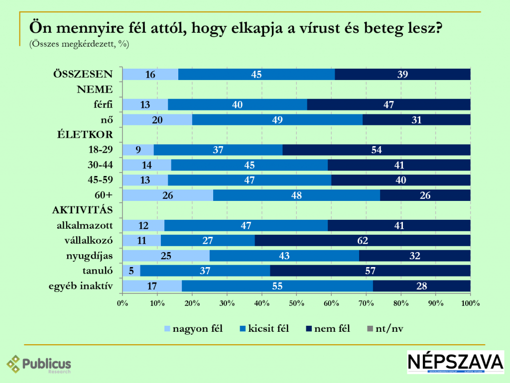 A férfiak közel fele (47 százalék), a 30 alattiak több mint fele (54 százalék), illetve a vállalkozók, valamint a tanulók (62 és 57 százalék) nem félnek a vírustól, és az általa okozott betegségtől.