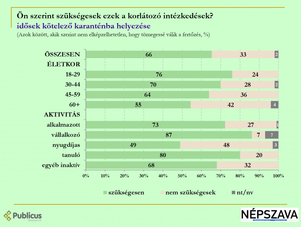 Az idősek karanténba helyezését kétharmad (66 százalék) szükségesnek látja. Leginkább a 30 év alattiak és a vállalkozók (76, illetve 87 százalék), míg legkevésbé a 60 év felettiek, és a nyugdíjasok (55, illetve 49 százalék).