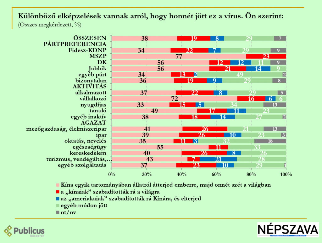 Az a gondolat, hogy a „kínaiak” szabadították rá a világra leginkább a mezőgazdaságban, az iparban, és a kereskedelemben dolgozok körében népszerű (26-26 százalék). Az viszont, hogy az „amerikaiak” szabadították rá Kínára, és onnét elterjedt, a vendéglátásban dolgozók, az inaktívak, és a Jobbik szavazók (21, 14, 14 százalék) körében terjedt leginkább el.