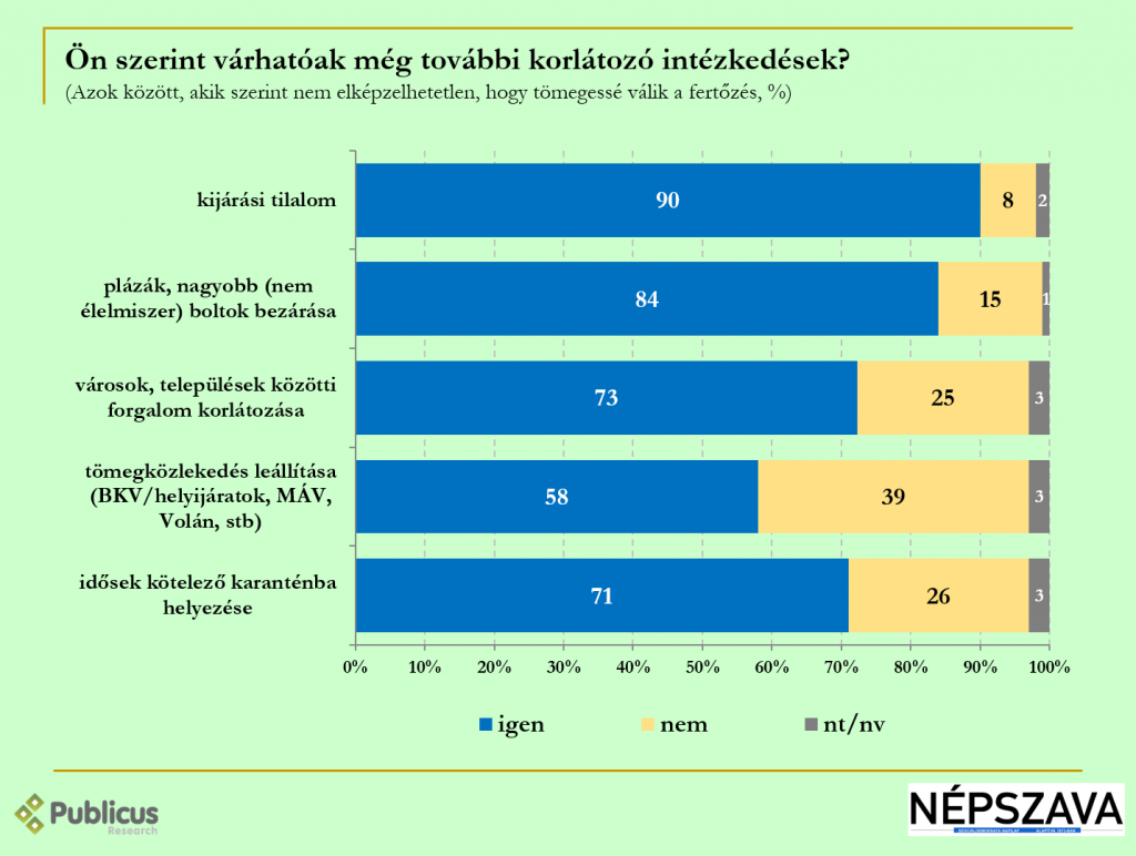 A megkérdezettek túlnyomó többsége számít további korlátozó intézkedésekre. Kijárási tilalom valamilyen szintjét tízből kilencen (90 százalék) várhatónak tartják. Majdnem ennyien (84 százalék) a nagyobb (nem élelmiszer) boltok, plázák bezárását is elképzelhetőnek gondolják.