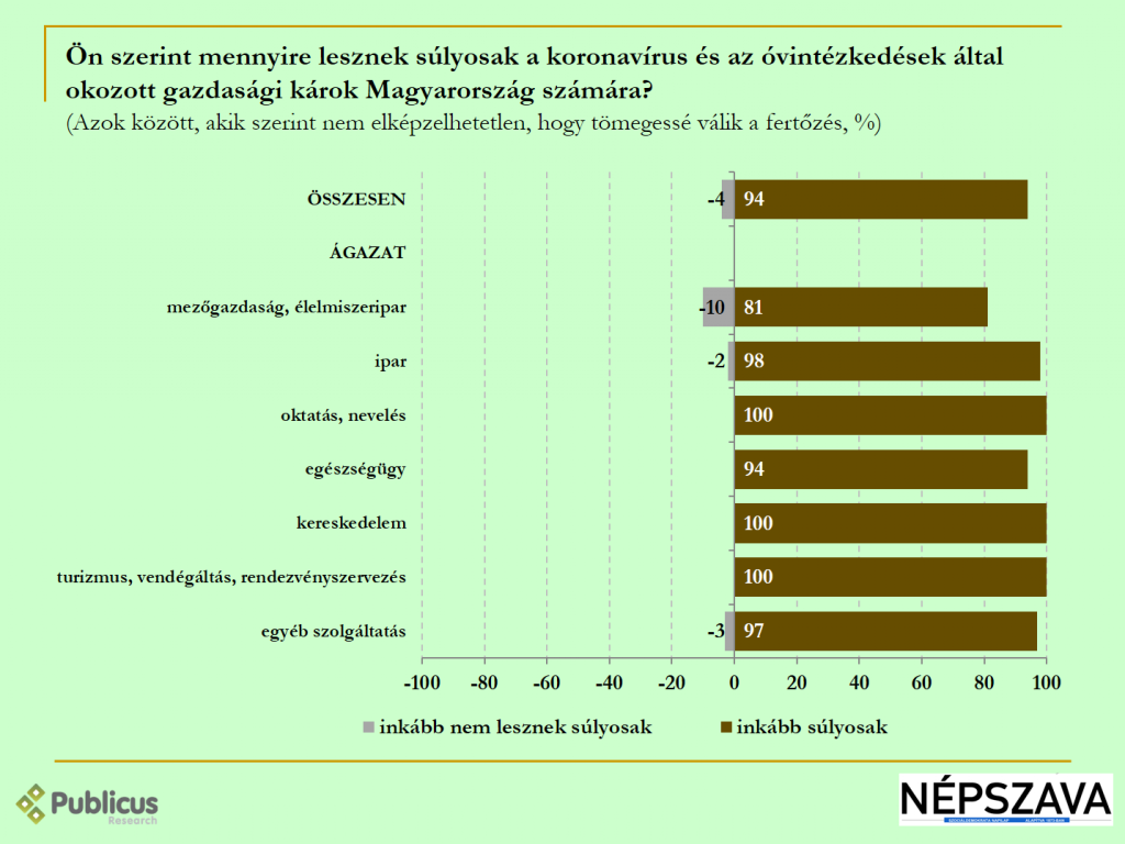 Tízből kilenc (94 százalék) megkérdezett szerint súlyosak lesznek a koronavírus által okozott gazdasági károk Magyarország számára. Az iparban, oktatás-nevelésben, egészségügyben, kereskedelemben, turizmus-vendéglátás és rendezvényszerzésben dolgozók szinte teljes egésze bizonyos abban, hogy inkább súlyosak lesznek a gazdasági károk hazánkban a koronavírus következtében. Egyedül a mezőgazdaságban, élelmiszeriparban dolgozók (81 százalék) látják kevésbé így.