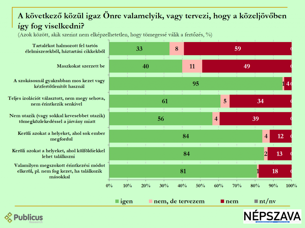 A megkérdezettek harmada (33 százalék) tervezi, illetve halmozott is már fel tartalékokat tartós élelmiszerekből, háztartási cikkekből, továbbá tízből négy (40 százalék) válaszadó szerzett már be, vagy tervezi maszkok beszerzését. Tízből kilenc (95 százalék) megkérdezett gyakrabban most kezet, vagy használ kézfertőtlenítőt, továbbá tizből hat (61 százalék) válaszadó teljes izolációt választott, azaz nem megy sehova, és nem is érintkezik senkivel.