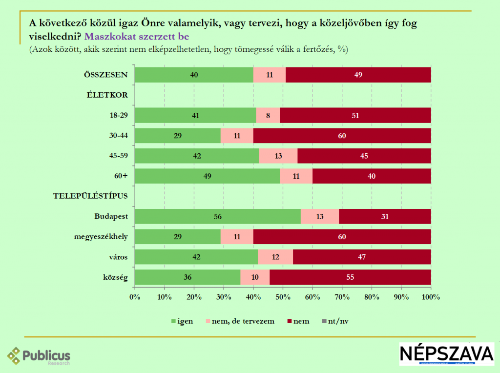 Leginkább az idősebbek, és a budapestiek azok, akik vagy szereztek már be maszkot, vagy pedig tervezik annak beszerzését. Minden második (49 százalék) 60 évnél idősebb, illetve tizből hat (56 százalék) fővárosi nyilatkozott így. Ezzel szemben főleg a 30 és 44 közöttiek, illetve a megyeszékhelyen élő válaszadók mondták azt, hogy nem tervezik maszkot beszerzését. Tízből hat (60 százalék) 30 és 44 közötti, továbbá szintén tizből hat (60 százalék) megyeszékhelyen élő nem kíván ilyen módon védekezni a koronavírus ellen.