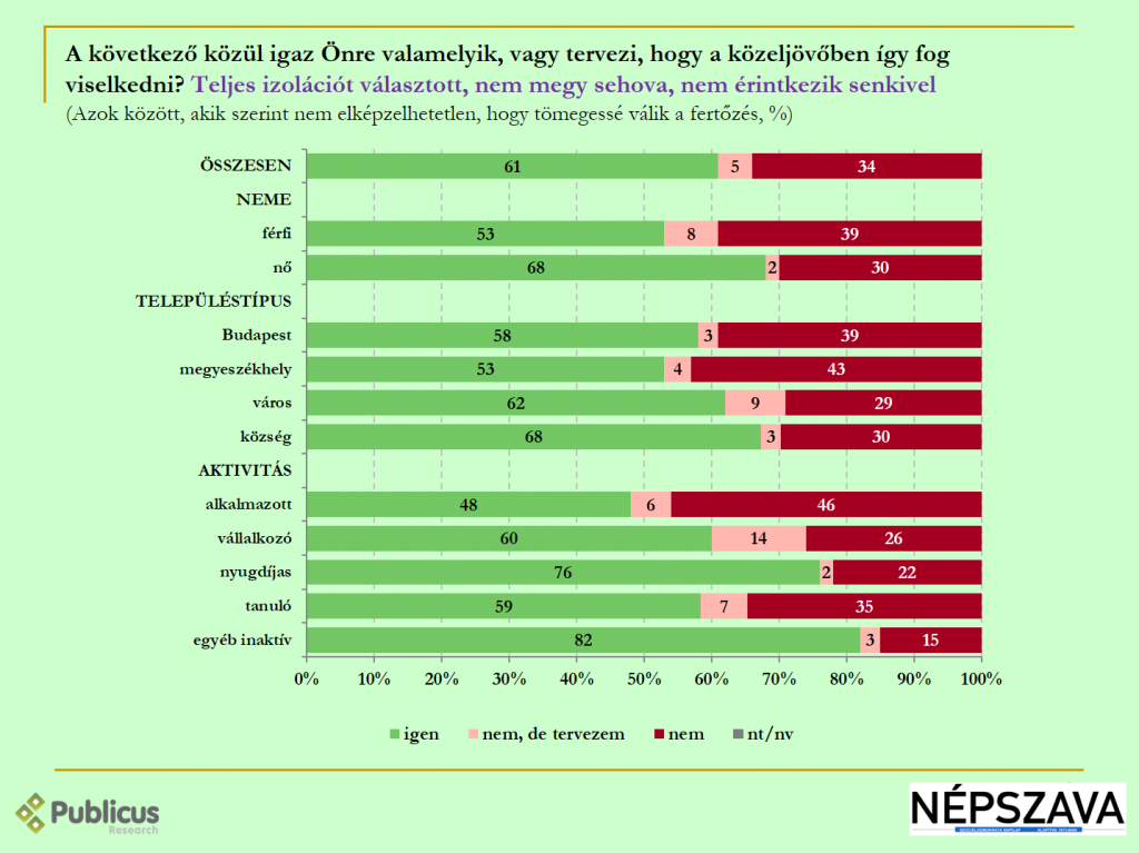 A nők kétharmada (68 százalék), a férfiak kicsivel több mint fele (53 százalék) tervezi, vagy pedig már most is a teljes izolációt választotta, azaz nem megy sehova, és nem érintkezik senkivel. Leginkább a községekben (68 százalék) és a városban élő (62 százalék) tervezik ezt, vagy pedig már most is így cselekszenek.