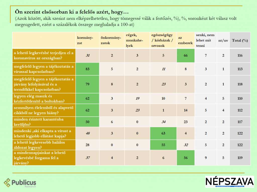 Tízből hat (63 százalék) megkérdezett szerint elsősorban az egészségügy felelős azért, hogy mindenki aki elkapta a vírust, a lehető legjobb ellátást kapja. A válaszadók több mint fele (55 százalék) szerint szintén a kórházak és az orvosok feladata elsősorban, hogy a lehető legkevesebb halálos áldozat legyen. Tízből közel hatan (56 százalék) mondták azt, hogy elsősorban az emberek felelősek azért, hogy a mindennapjainkat a lehető legkevésbé forgassa fel a járvány.