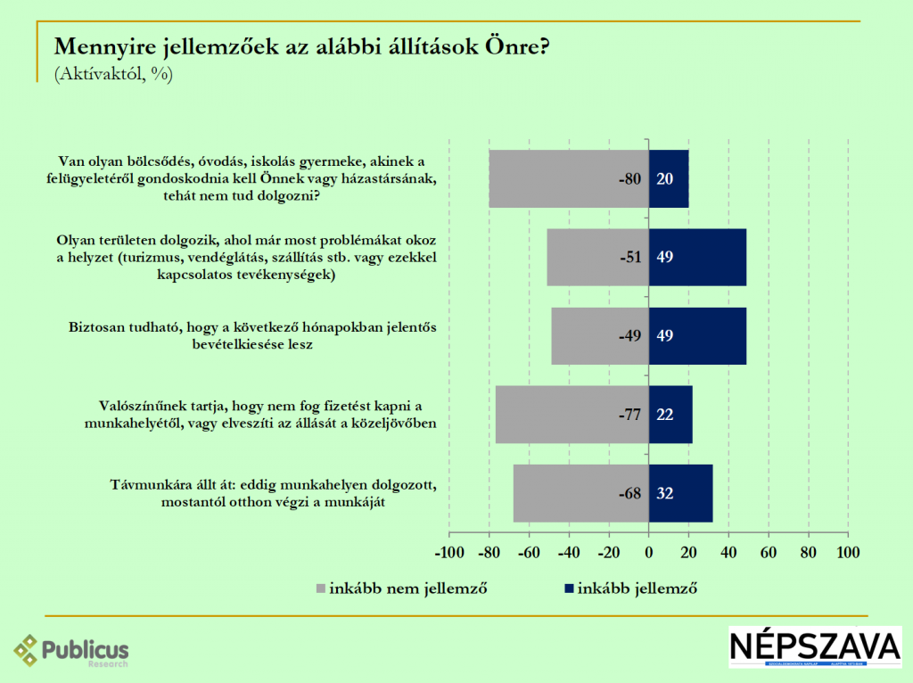 Minden második (49 százalék) megkérdezettre inkább jellemző, hogy olyan területen dolgozik, ahol már most problémákat okoz a helyzet (turizmus, vendéglátás, szállítás, stb. vagy ezekkel kapcsolatos tevékenységek.) Szintén minden második (49 százalék) válaszadóra inkább jellemző az, hogy bizonyosan tudható, hogy a következő hónapokban jelentős bevételkiesése lesz.