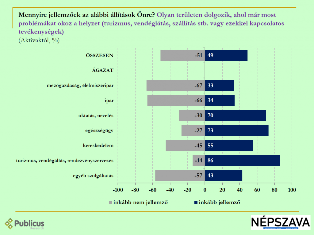 Főleg a turizmus, vendéglátás és rendezvényszervezés területén dolgozóknál (86 százalék) inkább jellemző az, hogy már most problémákat okoz a jelenlegi rendkívűli helyzet. Szintén magas arányban inkább jellemző ez az oktatás, nevelés (70 százalék) és az egészségügy (73 százalék) környékén dolgozók körében.