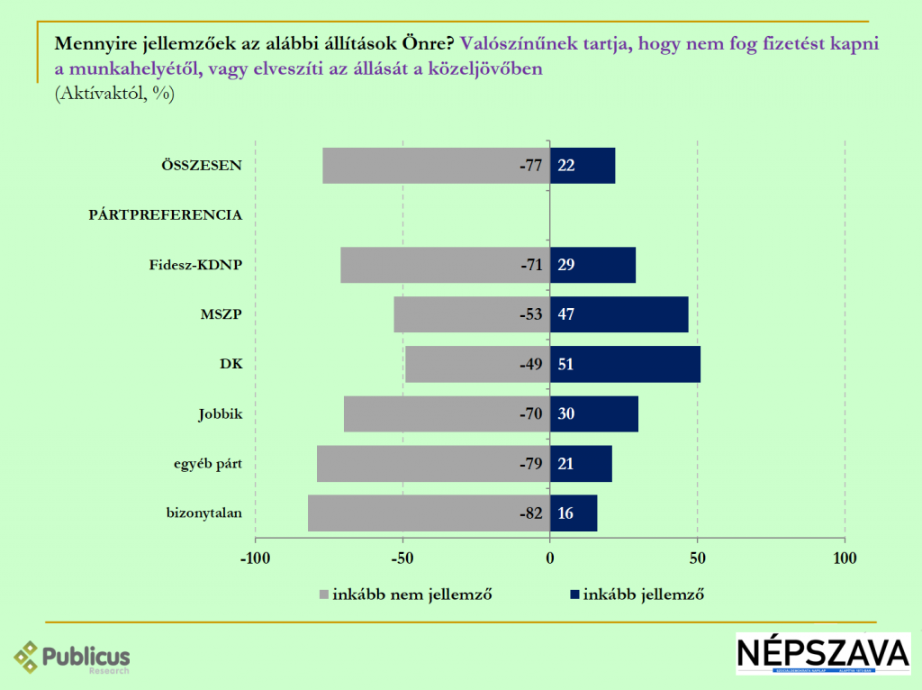 Minden második DK (51 százalék) és MSZP (47 százalék) szavazóra inkább jellemző az, hogy valószínűnek tartja, hogy nem fog fizetést kapni a munkahelyétől, vagy elveszíti az állását a közeljövőben. Tízből nyolc bizonytalan (82 százalék), illetve hét Fidesz-KDNP (71 százalék) és Jobbik (70 százalék) szavazóra azonban inkább nem jellemző, hogy valószínűnek tartaná, hogy ilyen nagy bajba kerülne a jövőben.