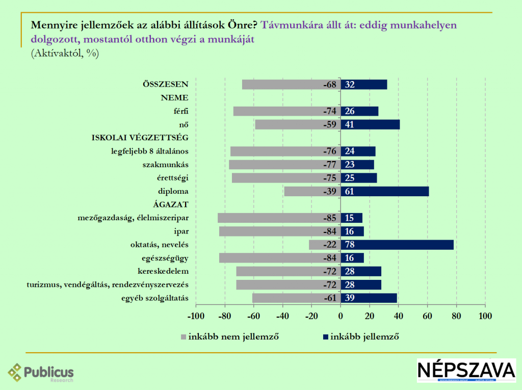 Tízből négy (41 százalék) nő, illetve a férfiak negyede (26 százalék) férfi válaszadó állt át legalább részben távmunkára, azaz eddig munkahelyen dolgozott, mostantól viszont otthon végzik munkáját. Leginkább a diplomásokra (61 százalék) és az oktatás, nevelés területén dolgozókra (78 százalék) inkább jellemző az, hogy átálltak az otthoni munkára. A legkevésbé ez a fajta munkavégzés a mezőgazdaságban (15 százalék), az iparban (16 százalék) és az egészségügyben (16 százalék) dolgozókra jellemző a leginkább.