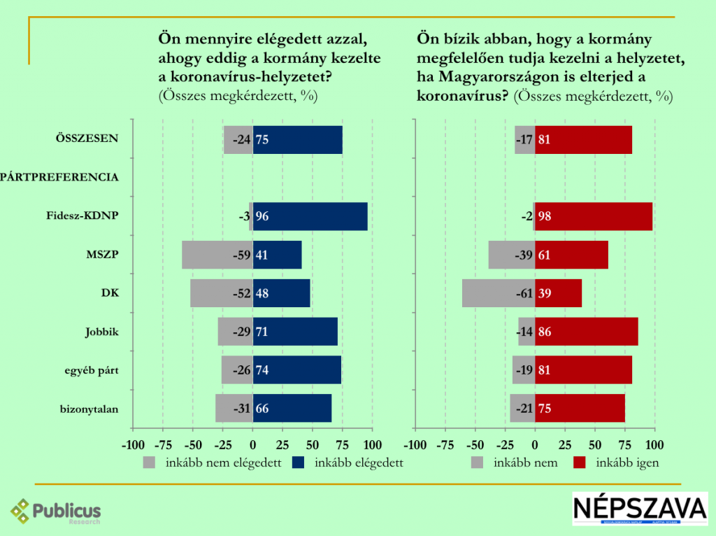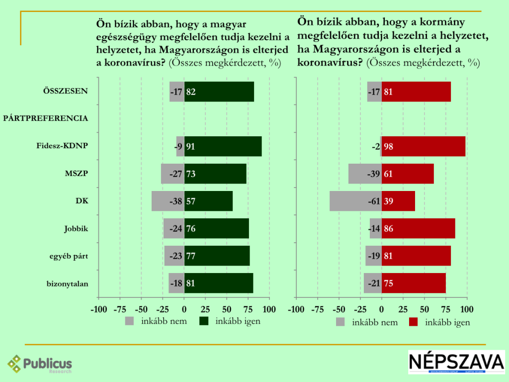 Tízből nyolc (81 százalék) válaszadó bízik abban, hogy a kormány megfelelően tudja kezelni a helyzetet, ha Magyarországon is elterjed a koronavírus. Szinte az összes (98 százalék) Fidesz szavazó bízik a kormányzat lépéseiben. Tízből hat (61 százalék) DK, és tízből négy (39 százalék) MSZP szavazó ezzel szemben inkább nem bízik abban, hogy a kormány megfelelően tudja kezelni a helyzetet.