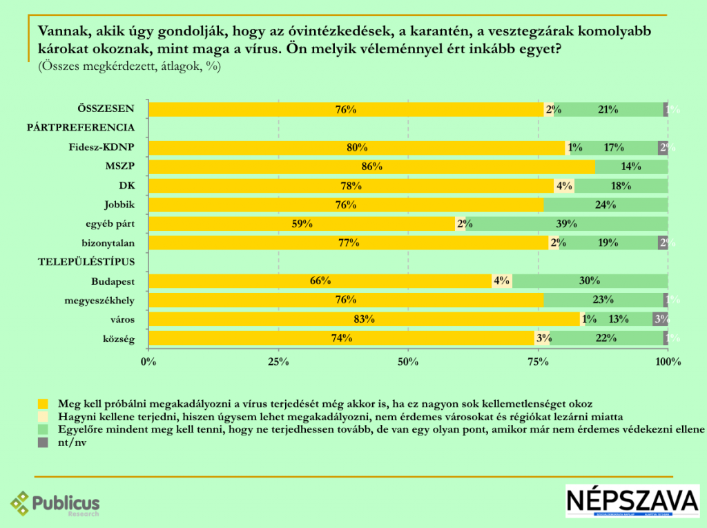 A pártpreferenciák, illetve a településtípusok alapján nincs jelentős eltérés a vélemények megoszlása között. Az utóbbi kategóriában a fővárosiak nagyobb arányban állítják azt – pontosabban közel a harmaduk (30 százalék), – hogy egyelőre mindent meg kell tenni a vírus ellen, hogy ne terjedhessen tovább, de van egy olyan pont, amikor már nem érdemes védekezni ellene.