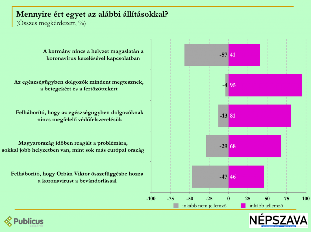 Szinte mindenki (95 százalék) egyetért azzal az állítással, hogy az egészségügyben dolgozók mindent megtesznek a betegekért és a fertőzöttekért. Tízből nyolc (81 százalék) megkérdezett azonban felháborítónak tartja azt, hogy az egészségügyben dolgozóknak nincs megfelelő védőfelszerelésük.