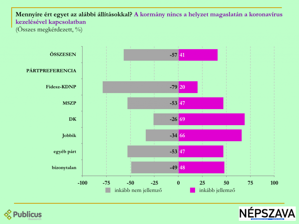 A Fidesz szavazók ötöde (20 százalék) szerint a kormány nincs a helyzet magaslatán a koronavírus kezelésével kapcsolatban. Leginkább a DK (69 százalék) és a Jobbik (66 százalék) szavazói gondolják így, körükben többségven is van ez az álláspont.