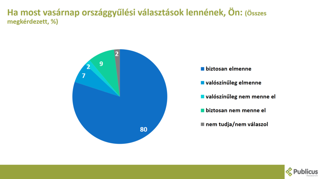 Ha most vasárnap országgyűlési választások lennének, tízből nyolcan (80 százalék) mondták azt, hogy biztosan elmennének, további 7 százalék pedig valószinűleg. Közel minden tizedik (9 százalék) válaszadó mondta azt, hogy biztosan nem menne el.