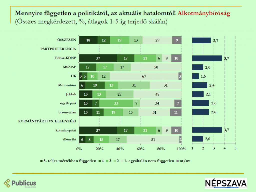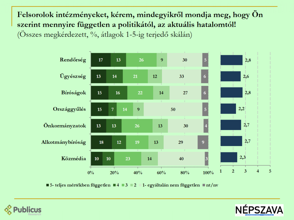 Publicus Intézet a Népszava megbízásából 2020. júliusában 1004 fő megkérdezésével készített országos reprezentatív közvéleménykutatásban vizsgálta az emberek véleményét arról, hogy szerintük mennyire független a politikától és az aktuális hatalomtól a rendőrség, az ügyészség, az Alkotmánybíróság, a bíróságok vagy éppen a közmédia.