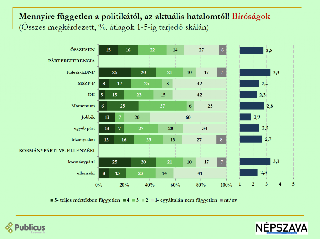 Minden hetedik megkérdezett mondta azt, hogy a bíróságok teljes mértékben függetlenek, közel minden negyedik válaszadó viszont úgy látja, hogy a bíróságok egyáltalán nem működnek a politikától, az aktuális hatalomtól független módon. Így gondolja tízből négy ellenzéki, továbbá közel minden ötödik kormánypárti szavazó is.