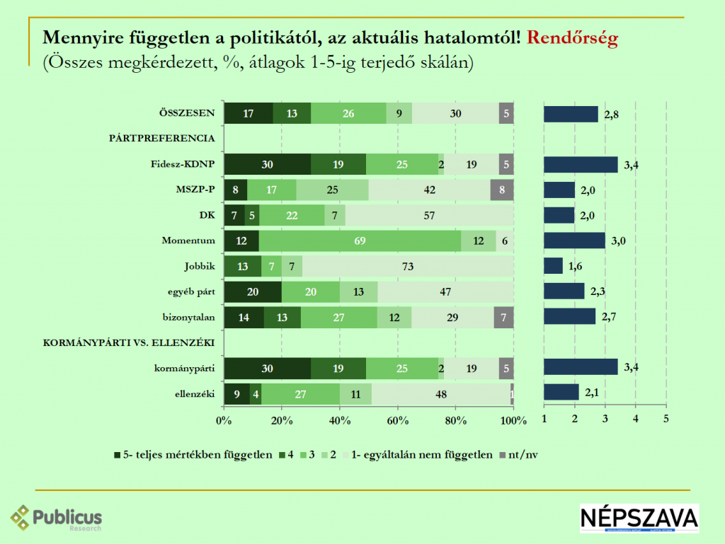 Minden tizedik (9 százalék) ellenzéki szavazó gondolja azt, hogy a rendőrség működése teljesen független a politikától, az aktuális hatalomtól. Minden második (48 százalék) ellenzéki szavazó szerint a rendőrség működése egyáltalán nem független a politikától. Leginkább a Jobbik (73 százalék), és a DK (57 százalék) szavazói látják így.