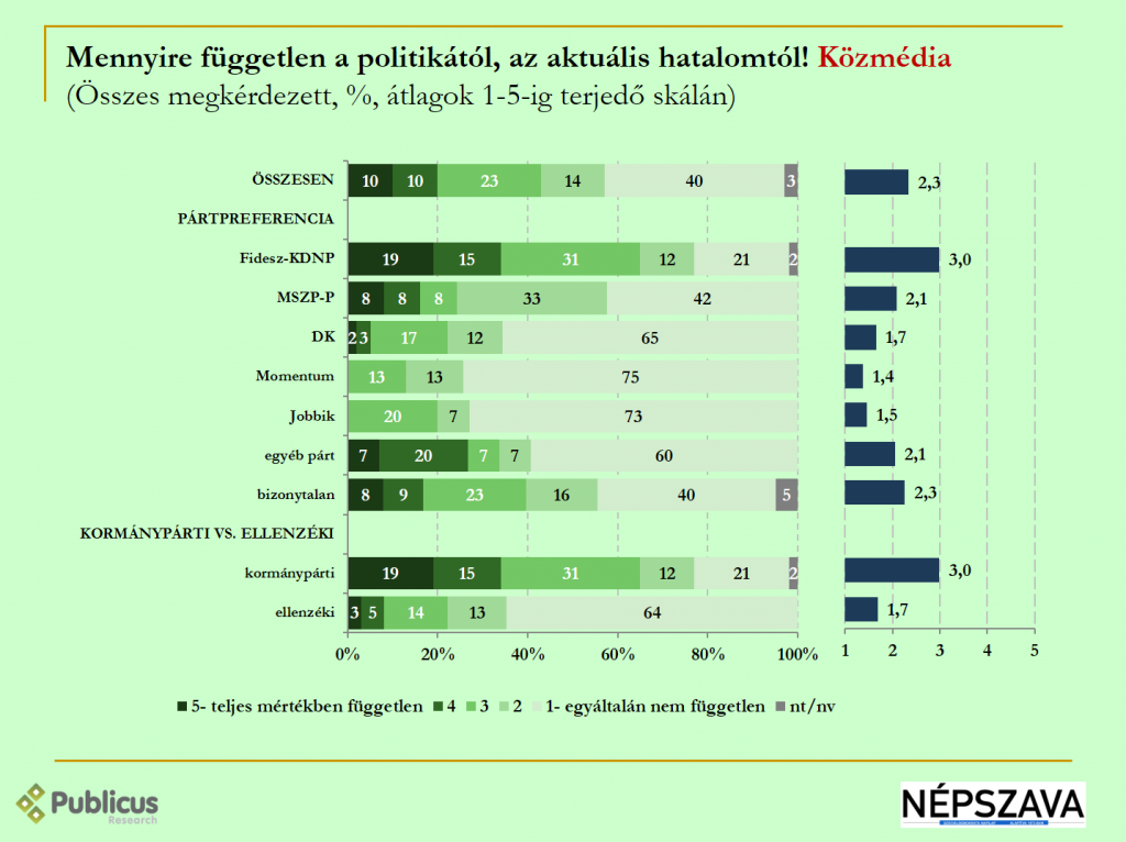 Minden tizedik megkérdezett szerint a közmédia független módon működik, tízből négy válaszadó szerint azonban egyáltalán nem működik függetlenül az aktuális hatalomtól. Így gondolják az ellenzéki szavazók közel kétharmada, továbbá minden ötödik Fidesz szavazó is.
