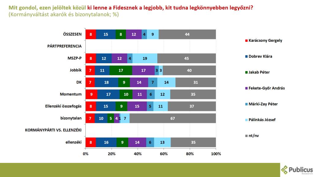 A kormányváltást akarók és bizonytalan szavazók 15 százaléka szerint Dobrev Klára, 12 százalék szerint Fekete-Győr András, 8-8 százalék szerint pedig Jakab Péter, illetve Karácsony Gergely lenne a Fidesznek a legjobb ellenzéki miniszterelnökjelölt, mivel őt tudná a legkönnyebben legyőzni.