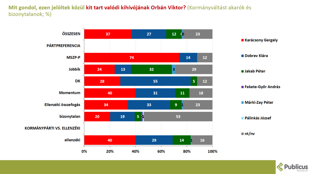 Tízből hat (55 százalék) DK szavazó, tízből három (31 százalék) Momentum szavazó, tízből kettő (19 százalék) bizonytalan szavazó, továbbá minden hetedik MSZP-P és Jobbik (14-13 százalék) szavazó szerint Orbán Viktor Dobrev Klárát tartja a valódi kihívójának. Így látja összességében tízből három (29 százalék) ellenzéki szavazó.