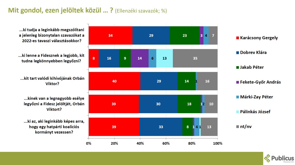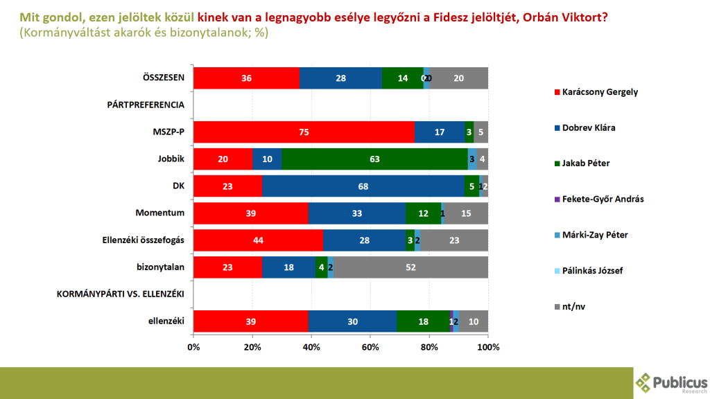 Az MSZP-P szavazók háromnegyede, tízből négy Momentum szavazó, a DK és a bizonytalan szavazók negyede, továbbá és a Jobbik szavazók ötöde szerint Karácsony Gergelynek van a legnagyobb esélye legyőzni a Fidesz jelöltjét, Orbán Viktort. Így látja összességében tízből négy ellenzéki szavazó.