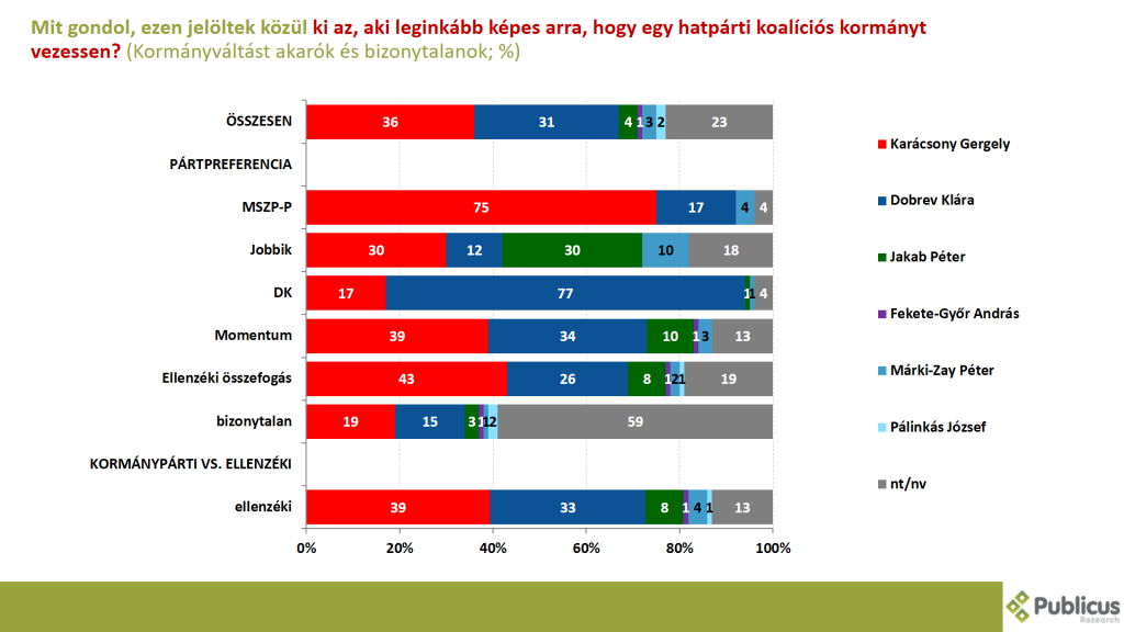 A DK szavazóinak háromnegyede (77 százalék), a Momentum szavazóinak a harmada (34 százalék), az MSZP-P szavazók ötöde (17 százalék), továbbá a bizonytalan szavazók 15 százaléka és a Jobbik szavazóinak 12 százaléka szerint Dobrev Klára az, aki a leginkább képes arra, hogy egy hatpárti koalíciós kormányt vezessen. Így látja összességében az ellenzéki szavazók harmada (33 százalék).