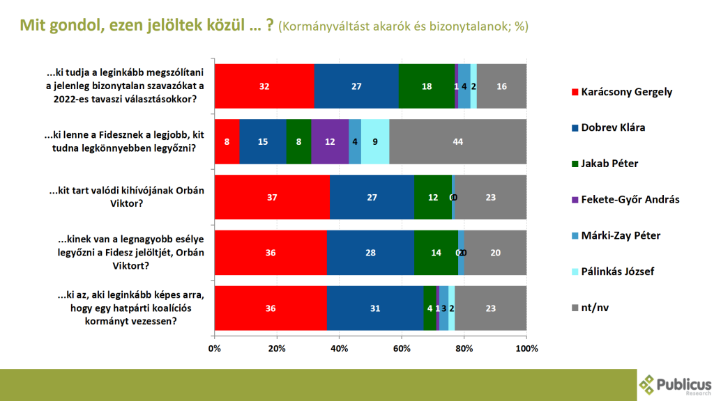 A kormányváltást akaró és bizonytalan szavazók közül tízből négy szerint Karácsonynak, tízből három szerint Dobrevnek, minden hetedik szavazó szerint pedig Jakabnak van a legnagyobb esélye legyőzni a Fidesz jelöltjét, Orbán Viktort.