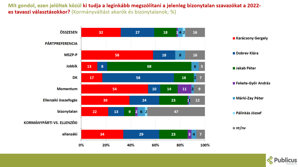 Minden harmadik (32 százalék) kormányváltást akaró és bizonytalan szavazó szerint Karácsony Gergely, minden negyedik (27 százalék) szerint Dobrev Klára, minden ötödik (18 százalék) szerint pedig Jakab Péter tudja a leginkább megszólítani a jelenleg bizonytalan szavazókat a 2022-es tavaszi választásokkor.