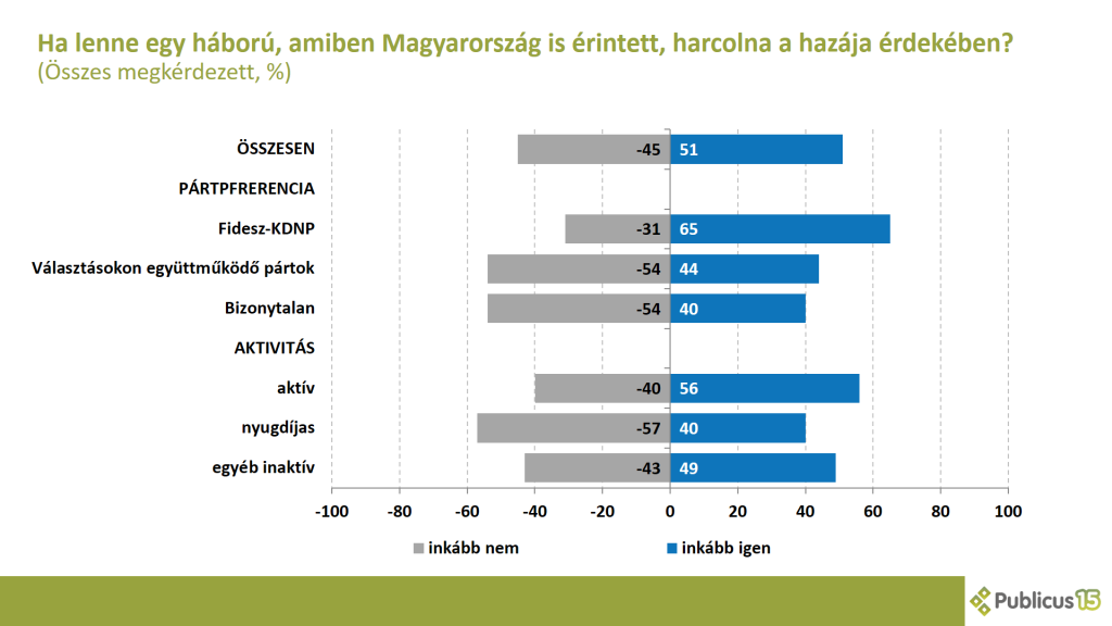 Az aktív státuszúak 56 százaléka, a nyugdíjasoknak meg a 40 százaléka mondta azt, hogy ebben az esetben harcolna hazája érdekében.